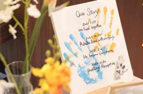 キャッスルガーデンOSAKAは貸し切りのラウンジスペースがあります。ゲストの皆様が入って一番初めに目に触れる空間になりますので、お二人色に染めていただくとゲストの皆様も楽しんでいただけます。 お二人の手形をのせたストーリーにゲストの皆様もたくさんお写真をおさめてくださっていました。 結婚式においてお二人で手作りアイテムを作るお時間もぜひ楽しんでください!