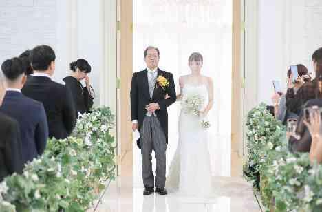 チャペルには一つひとつに意味があり、人生の時の流れを表しています。 バージンロードは、一歩一歩が一歳二歳と、過去から現在を歩む道となっており、これまでの想い出をゆっくりとかみしめながら大切な方と歩んでいただきます。 ご新婦さまの手を、お父様がご新郎様に託す瞬間は、様々な感情がこみ上げる特別な瞬間であり、全員が感動に包まれます。