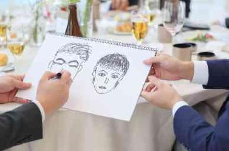 ゲスト様全員、それぞれのテーブルで1つのチームとなり、対抗似顔絵大会を行いました! ご新郎様ご新婦様おふたりのことを観察しながら、パーツごとにバトンを繋ぎ、全員で協力して世界に一つだけの似顔絵を完成させました。 一番似ていた似顔絵を描いたチームには、おふたりから景品が贈られました。 おふたりの大好きなゲスト様にも楽しんでいただける、笑顔で溢れる演出となりました。