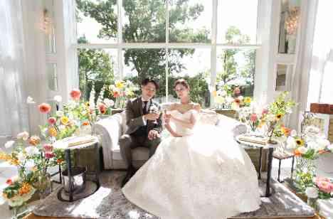 キャッスルガーデンOSAKAの披露宴会場はシンプルな白基調の会場となっているため何色にも染めていただけます。、 どのお花のコーディネートでもぴったりと合う緑のロケーションのため、おふたりのお好きなコーディネートを楽しんでいただけます。 また、ガラス張りの会場から自然光が入るように天井高を高くしておりますので、新郎様新婦様もゲストの皆様も開放的な空間を感じていただけます。