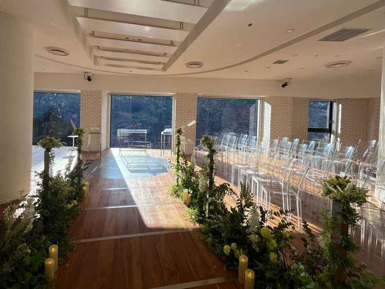 チャペルや披露宴会場から、日本庭園や緑を見ることができ、眺望が良いと感じました。またホテル内は高級感も感じられました。