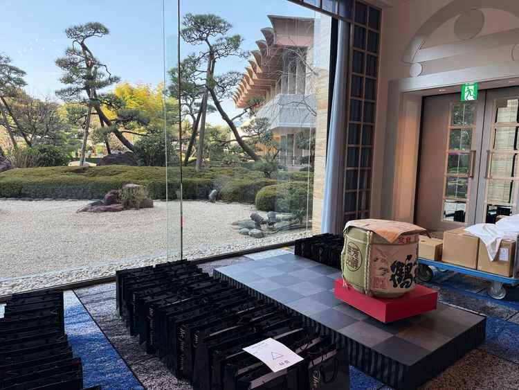 会場から見える庭園は圧巻です。水辺から見える桜もとても綺麗でした。赤い橋についても印象的に見えました。