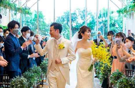 結婚式のスタートである挙式はゲストの皆様の笑顔溢れる空間に。ホールガーデンチャペルは自然光が柔らかく降り注ぐ木と緑に包まれた空間でゲストの皆様もリラックスして挙式に参列くださり、ゲストの皆様からの「おめでとう」と共におふたりからの「ありがとう」が伝わる時間に。ゲストからの盛大な拍手に包まれ幸せな時間が流れました。