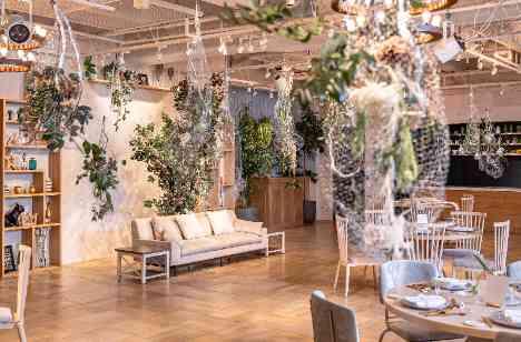 ゲストとの距離感を大切にしたいという想いから、高砂はなくし、ゲストテーブルの装花もあえて一輪挿しにしてシンプルを極めたコーディネートに。ただ会場の雰囲気ががらんと、寂しくならないように空間にフラワーアレンジメントを《浮かせる》という大胆な発想をフローリストさんが提案してくれました。テーブル上はすっきりと整えられ、料理と歓談を楽しむコンセプトにぴったりの空間になりました。