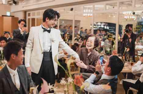 パーティが進み、お色直しのための中座のお時間☆ ご新婦様はお姉様と、ご新郎様はおばあ様にエスコートしていただきながら中座となりました。サプライズで呼ばれたお二人は、驚きながらも手を取り、皆様の前を歩かれてました♪ 大切な方と歩く特別なお時間は、笑顔が溢れる素敵なひとときとなった中座のお時間でした・・・♡