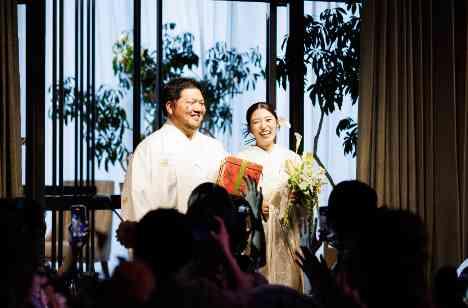 楽しく笑顔で過ごされた披露宴も終盤へ。新郎様から皆様へ挨拶があり、めでたくパーティーもお開き…かと思いきや、披露宴のフィナーレには新郎様から新婦様へサプライズが!ご準備されたのは新婦様をイメージして黄色やオレンジ系の明るい色の花束でした。ネックレスもプレゼントされ、ロマンチックな永遠の愛の誓いに、会場からは大きな拍手が沸き起こり、おふたりの特別な1日が結びました
