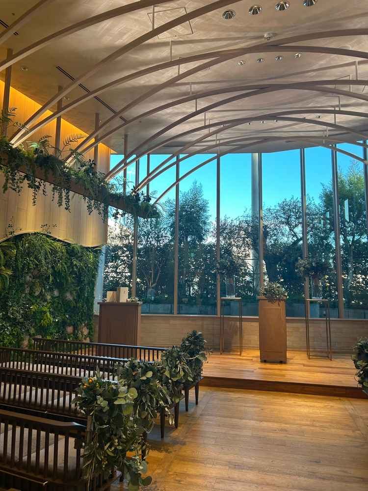 木目調にグリーンがたくさんで、ナチュラルで素敵な雰囲気です。 7Fの披露宴会場はリビングルームがテーマということで、リラックスして参加できそうな雰囲気でした。