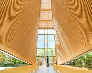 【感謝を伝えるオリジナルセレモニー】緑に囲まれた木目調のチャペルは、緊張しがちな2人をリラックスさせてくれる。形式ばった挙式ではなく、ゲストと創る2人だけのセレモニー。ガーデンでアフターセレモニーも!