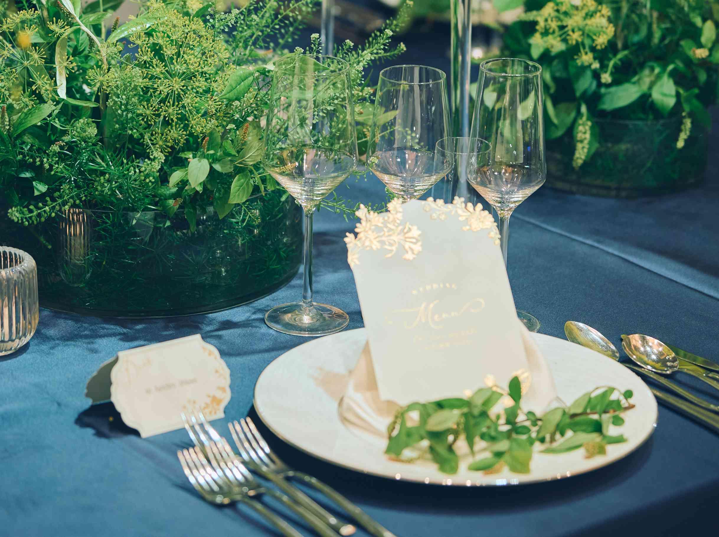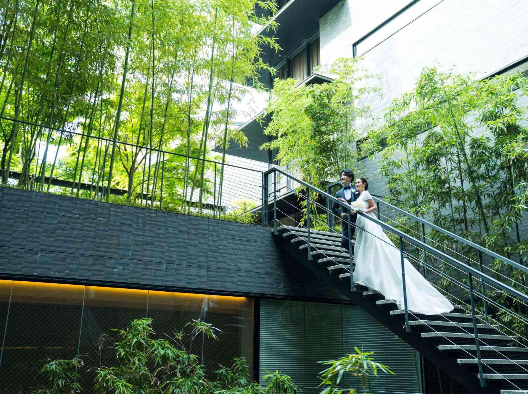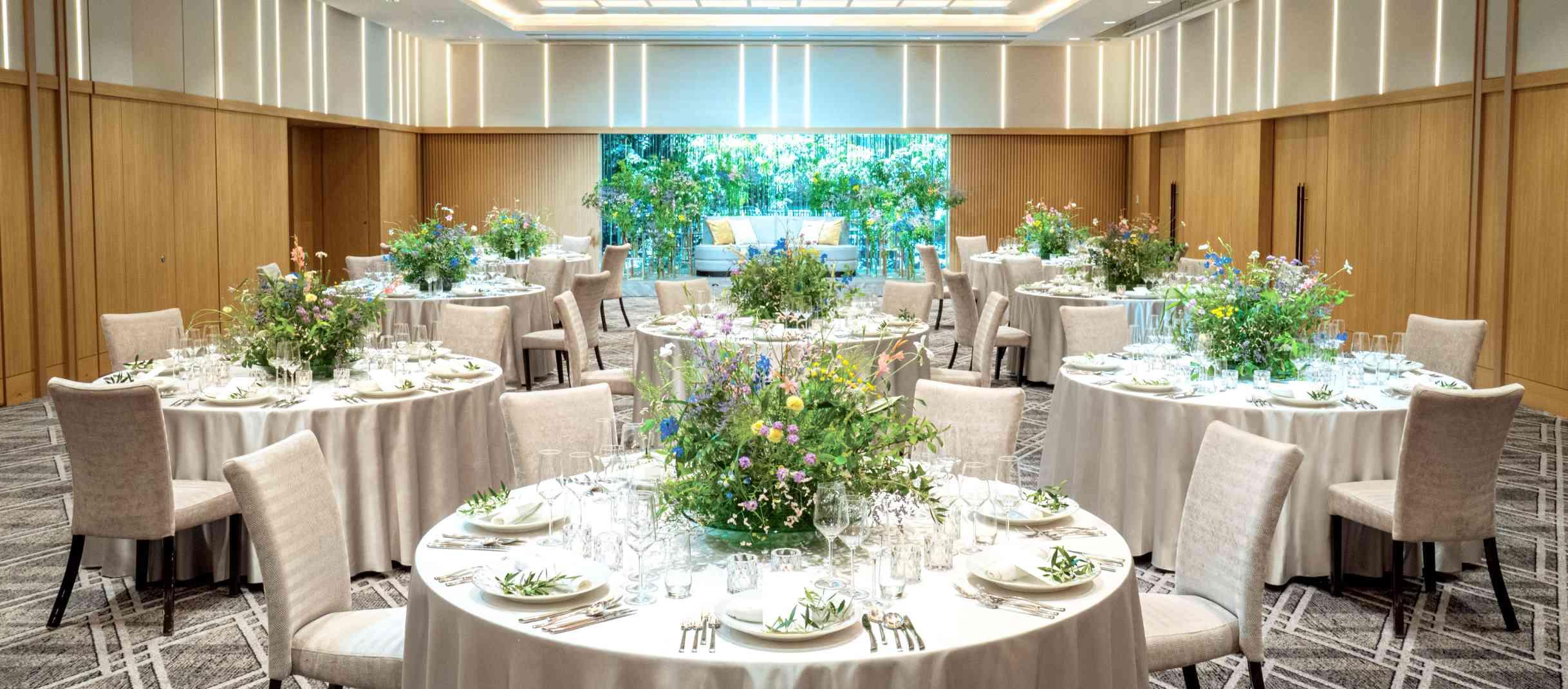 「千」の響きに永遠に続く思いを込めて。 目の前でシェフたちが料理を仕上げていく、その躍動感も味わえるライブキッチンを併設。 やわらかな光と坪庭の緑が映えるバンケット・スタジオ。