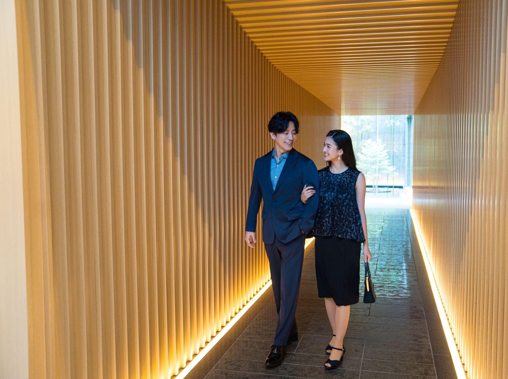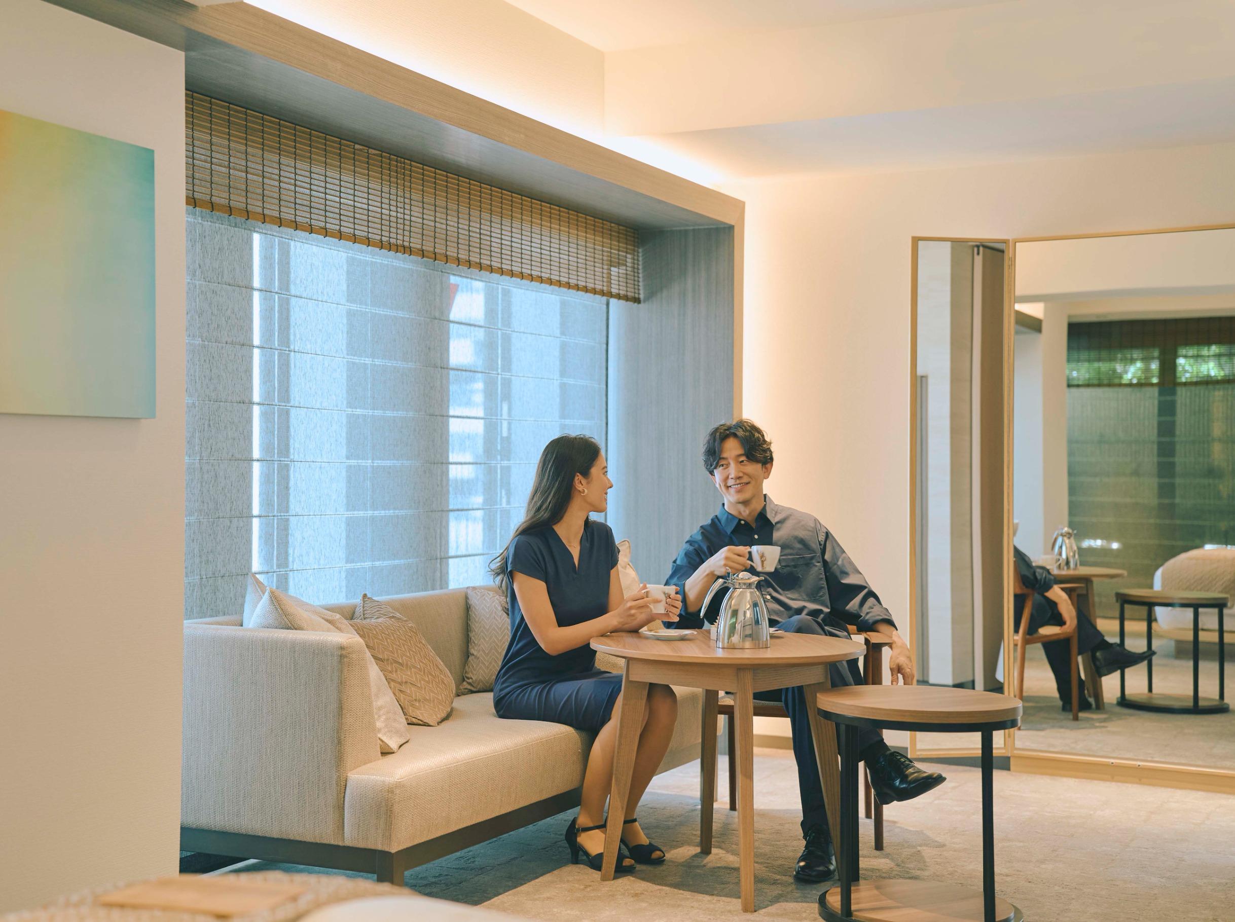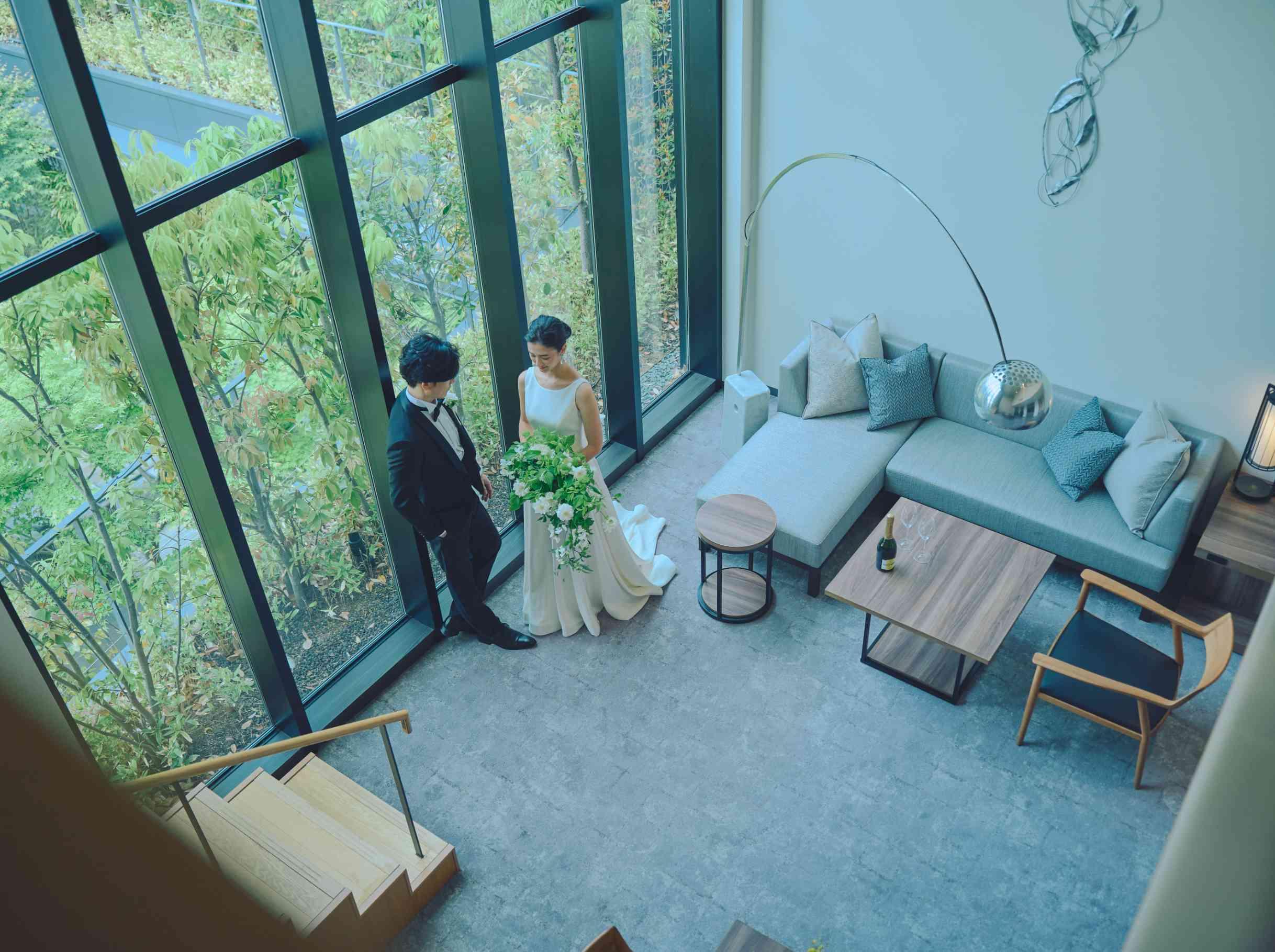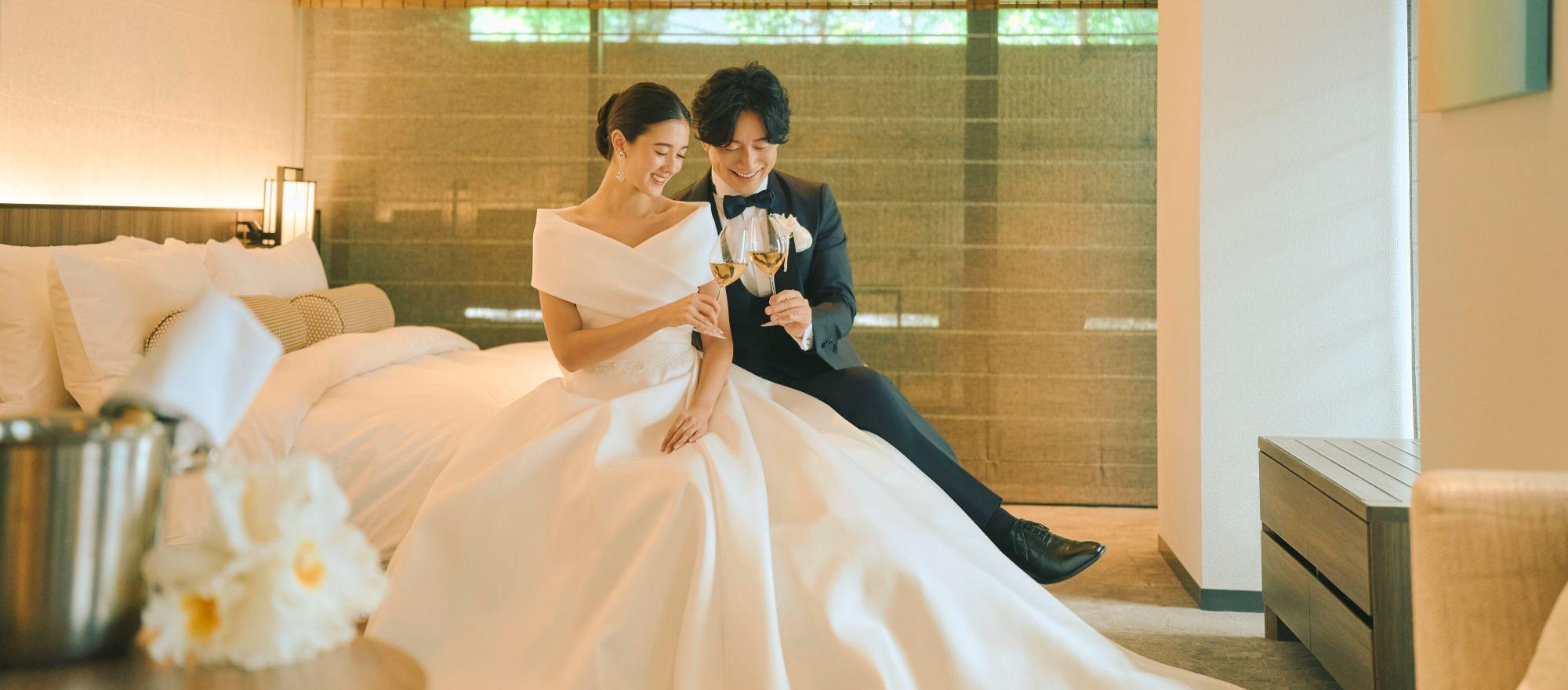 結婚式前夜から2人だけのゆったりとした時間を。当日早朝から慌ただしくすることもなく、宿泊しているスイートルームがお支度部屋に。リラックスした雰囲気の中準備を。結婚式後は余韻に浸り、新たな家族の始まりを