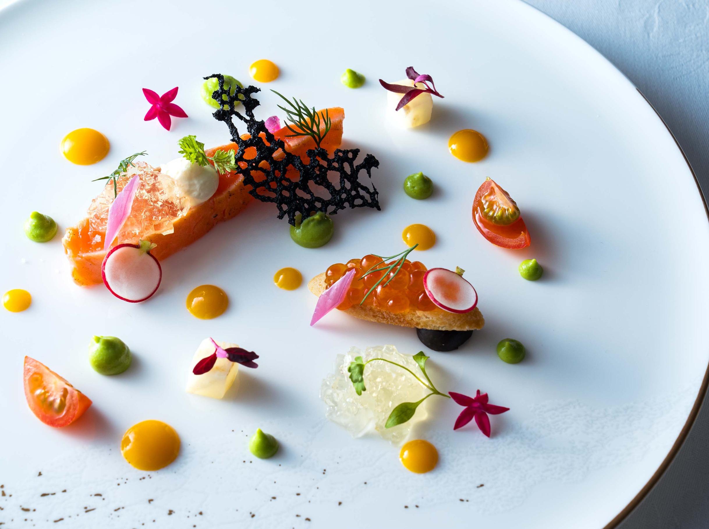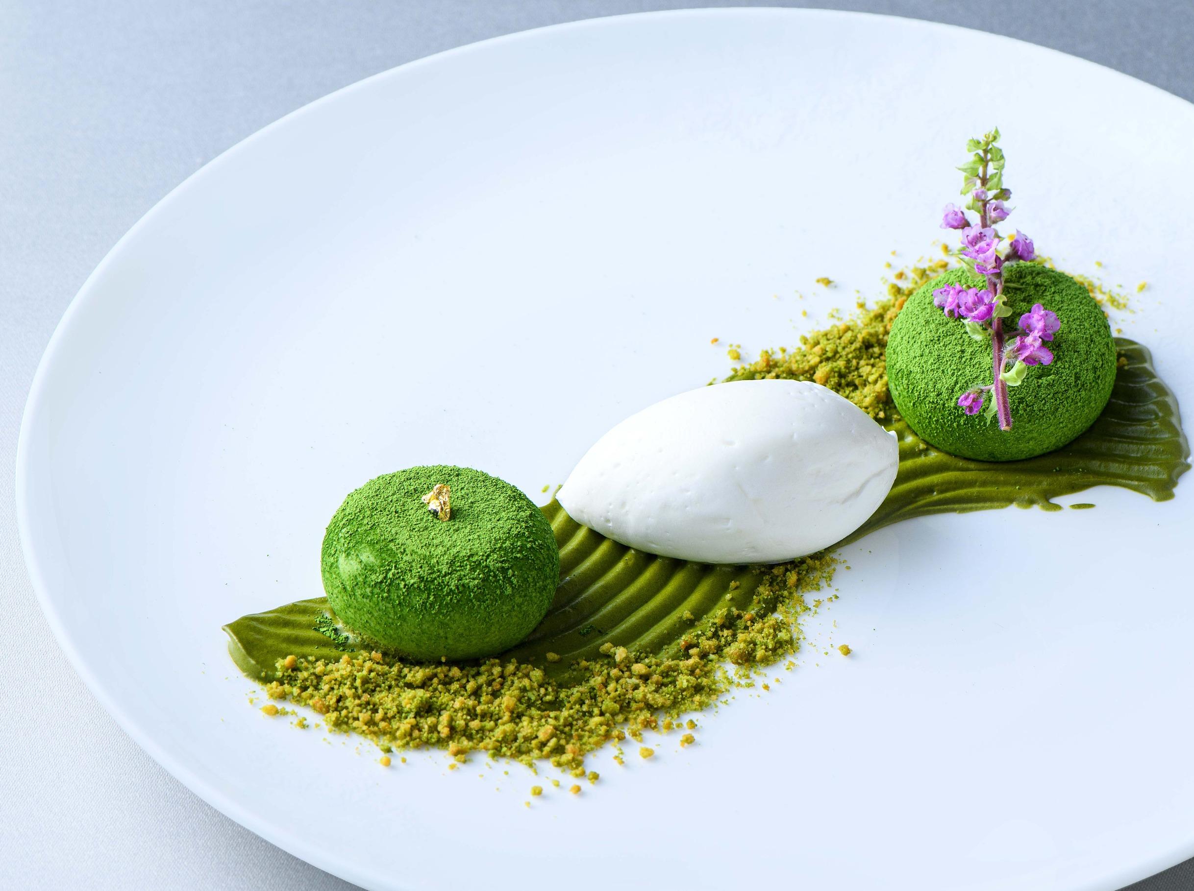 できたての料理をベストなタイミングで提供するライブキッチンは調理の音や香り、シェフのパフォーマンスを演出として楽しめ、ゲストの皆さまの記憶に残るおもてなしを。宝石のように美しい5種のスイーツも好評。