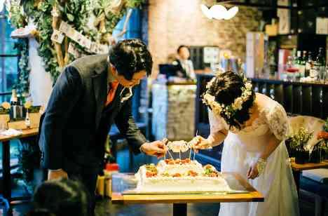 新郎様のご挨拶と乾杯をかけ声にパーティーがスタート!「ゲストと一緒に飲んで食べてワイワイする!」というのがお二人のご希望通り、皆様とリラックスした雰囲気で楽しまれているご様子でした! 披露宴中の演出として、普通のケーキカットはつまらない!ということで、共同作業はケーキにトッパーを指すという演出に。そのトッパーも「Thank you」というゲストへの想いを込めたものでした♪