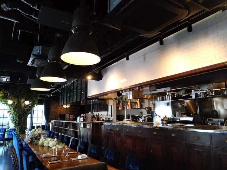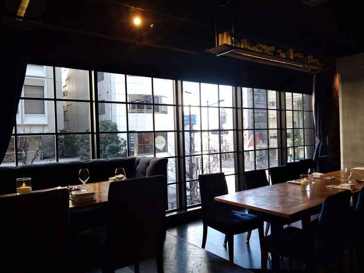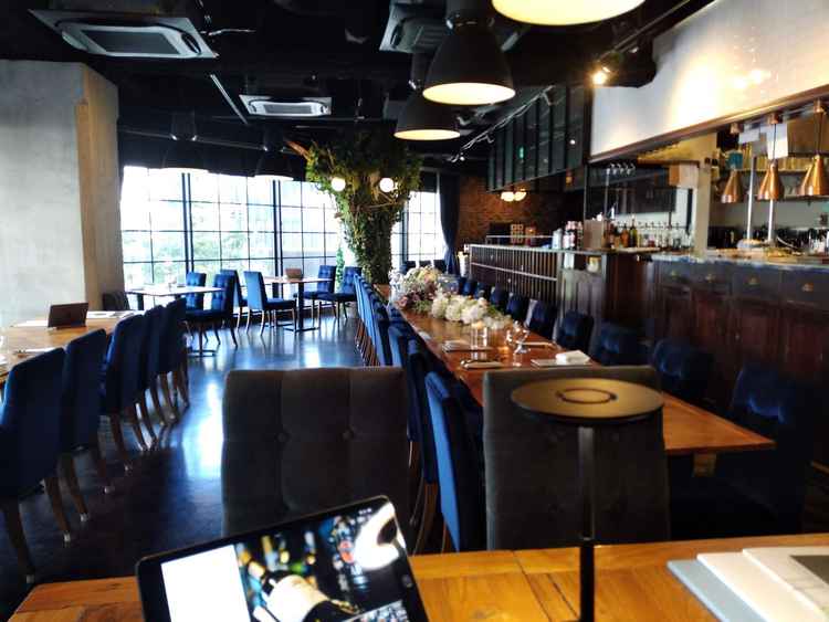 青の椅子とウッディーな内装が素敵。キャンドルなどの装飾もかわいい。壁一面窓なので開放感があり、キッチンも見えるようになっている。