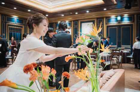 ゲストの皆様にご参加いただくフラワービュッフェ。 おひとり様1本ずつお好きなお花をお選びいただき、ご自身のテーブルの花瓶に生けていただきます。 お選びいただくお花によって、唯一無二のデザインが出来上がります。 新郎新婦様にもご参加いただき、メインテーブルはおふたりにデザインしていただきました。 テーマカラーでもあるオレンジのお花をふんだんに使用した、とても華やかな雰囲気となりました。