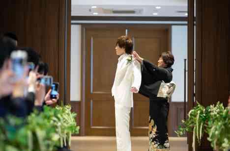 花嫁のベールダウン。大変人気のあるこのシーンは見たことがある方も多いことでしょう。『最後のお仕度』ともいわれるこのシーンを、新郎様のお母さまにも味わっていただきたい。感謝を改めて伝える機会を作っていきたい。 そんなご要望から生まれたのが新郎様のジャケットセレモニー。小さい頃お仕度をしてあげていた事を思い返していただきながら、大きくなった息子の背中にジャケットを羽織らせる姿は感慨深いワンシーンに。