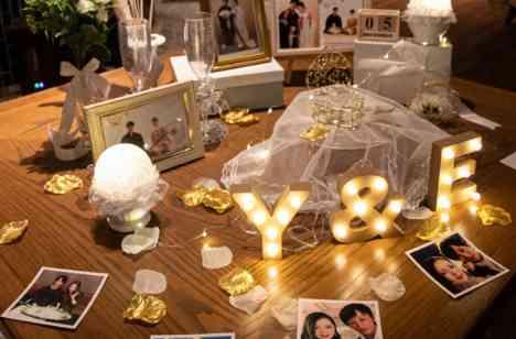 ウェルカムグッズ、ウェディングケーキの装飾、結婚証明書とこだわりのアイテムを手作り♩当日のゲストの待合室にはゲストの皆様とのお写真をたくさん飾りました!会場はお二人の貸切なのでコーディネートもお二人らしさを詰め込みました☆