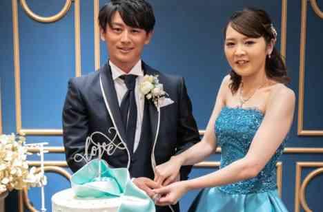 某世界的人気アニメが大好きな新婦様。真っ白なケーキに水色のリボンを巻きつけ、ポイントでバラのモチーフを散りばめました♩ ボールルームのネイビーの壁と統一感もありカラードレスとの相性もよく新婦様のこだわりが伝わるシーンでした♩ ファーストバイトの後はご友人にサンクスバイトのプレゼント☆ 披露宴の信仰はシンプルにゲストとのフォトタイムや歓談を楽しまれました♩