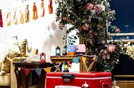 音楽・フェスの雰囲気・キャンプなどアウトドアなお二人♩ラウンジを”ネオンステージ”ボールルームを”sunステージ”シアタールームを”moonステージ”に。sunステージにはお二人らしくcampコーディネートに♩お二人手作りのガーランドやミニテント、マグカップなど交えて会場をコーディネート。普段はシックで落ち着いたボールルームはまさに明るいsunステージに!!
