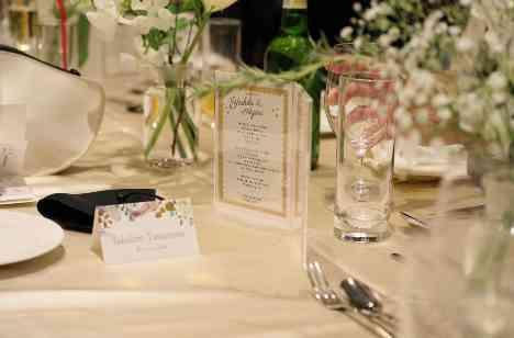 通常100名以上収容の「ボールルーム」少ない人数でも広々ご使用いただけます。テーブルコーディネートにはたくさんのお花と小物。こだわったゲストひとりひとりの席札を。白と緑がマッチしナチュラルで大人かわいいコーディネートが目の前にひろがります。プロのコーディネーターが1組ずつ担当するのでおふたりのイメージを存分におつたえください。