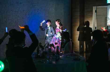新婦様のこだわり演出の一つ、大切なゲストに囲まれて、大好きな曲で大好きな人と再入場!会場内はまさにアイドルのライブ会場のような一体感に包まれました。ゲストお一人お一人にサイリウムを用意して、お二人とご家族は新婦様の宝物のペンライト!お祝いの気持ちをたくさん込めて再入場シーンを盛り上げてくださいました。