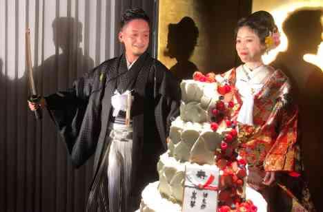演出でも『和』にこだわりを持ったおふたり。 ケーキ入刀ではご新郎様が刀をかざし入刀。これには会場もびっくり。 ご新婦様は、成人式でご自身が召されていた振袖をアレンジした『オリエンタル和装』の衣装を身にまとい入場。 とてもお似合いでした。