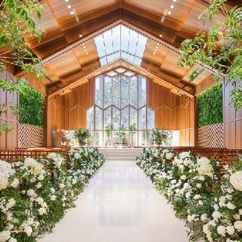 天井のスリットから注ぎ込む自然光と煌く緑が優しくお2人を見守ります。大好きな人たちの笑顔に囲まれて木のぬくもりを感じる開放的な空間は一番大切な人と永遠を誓うのにふさわしい場所。