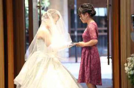 ご新婦様がウエディングドレスを一番見せたかったお母様は、当日お写真でのご参加となりました。 ベールダウンは幼い頃から一緒に過ごしてきた妹様が。お母様にも見て頂けるよう、チャペルの天窓を開けての挙式となりました。