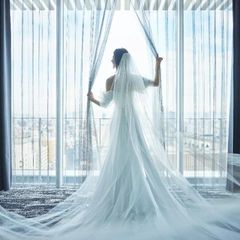 【後日現地見学会にて模擬挙式体験】和紙の壁や木のバージンロードといった天然素材を使用。花嫁を美し引き立てる建築美。ホテル最上階ならではの絶景!降り注ぐ陽光が輝きに溢れた空間を創り出す!