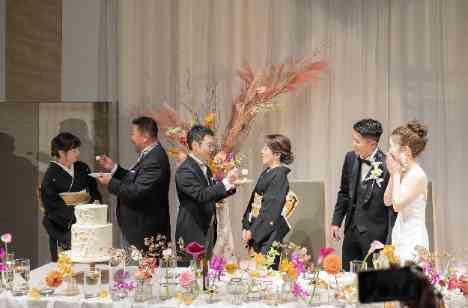 いよいよウェディングパーティーがスタート!大切なゲストの皆様と楽しいお時間をすごしていよいよファーストバイトのお時間!おふたりに親御様よりお手本バイトを頂戴してから食べさせあいっこ、おいしそうにほおばっていました!親御様と仲が良い新郎新婦様。お手本バイトのシーンは会場スタッフがとても微笑ましい雰囲気でみておりました...会場が盛り上がった瞬間でした