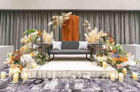 新型コロナウイルスの影響で1度延期したもののその分会場の装花デザインも練り直し、お2人ならではのこだわり空間に。特にメインテーブルはソファデザインにし、テラコッタをテーマカラーにアレンジ。1人が1つ1つ手作りした鍵の席札やウェルカムスペースもゲストに大好評!どこをきり取っても、お写真映えする素敵な空間となりました