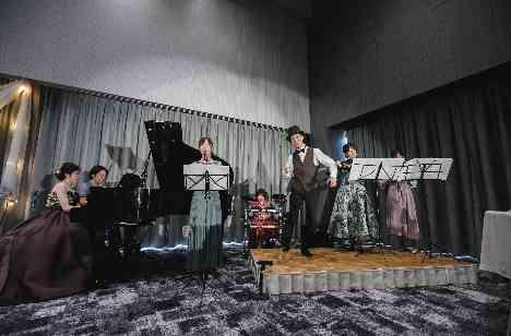パーティーでは花嫁様とご友人様による演奏が行われました。花嫁様はピアノを演奏されておりました。 なんと花嫁様にはサプライズで演奏中に新郎様がタップダンスを披露されました。 花嫁様は驚きながらも演奏を続けられており、新郎様の華麗なステップと花嫁様の軽やかなピアノで一気に会場中のテンションが高くなりました。