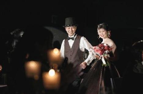 再入場はまるで映画のワンシーンのように新郎様のシルエット入場でスタート。 ハッとするような演出で登場された新郎様は階段上にいらっしゃる花嫁様をお迎えに行かれました。 おふたりが揃われたあと、おふたりの合図で会場中のキャンドルに一斉に灯りが点きました。 まるで魔法のような素敵な演出が続き、まるでひとつの映画を見ていたようでした。