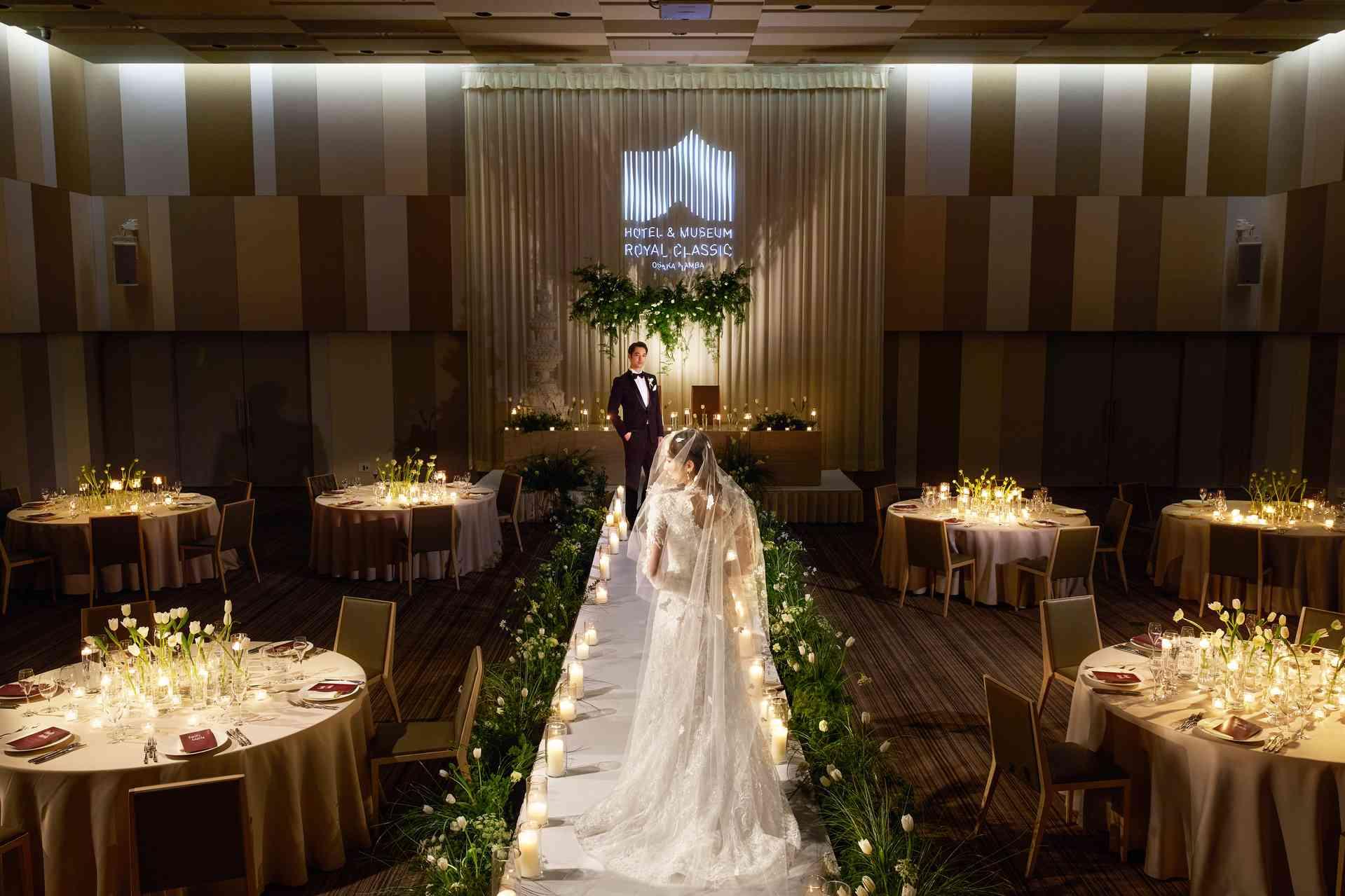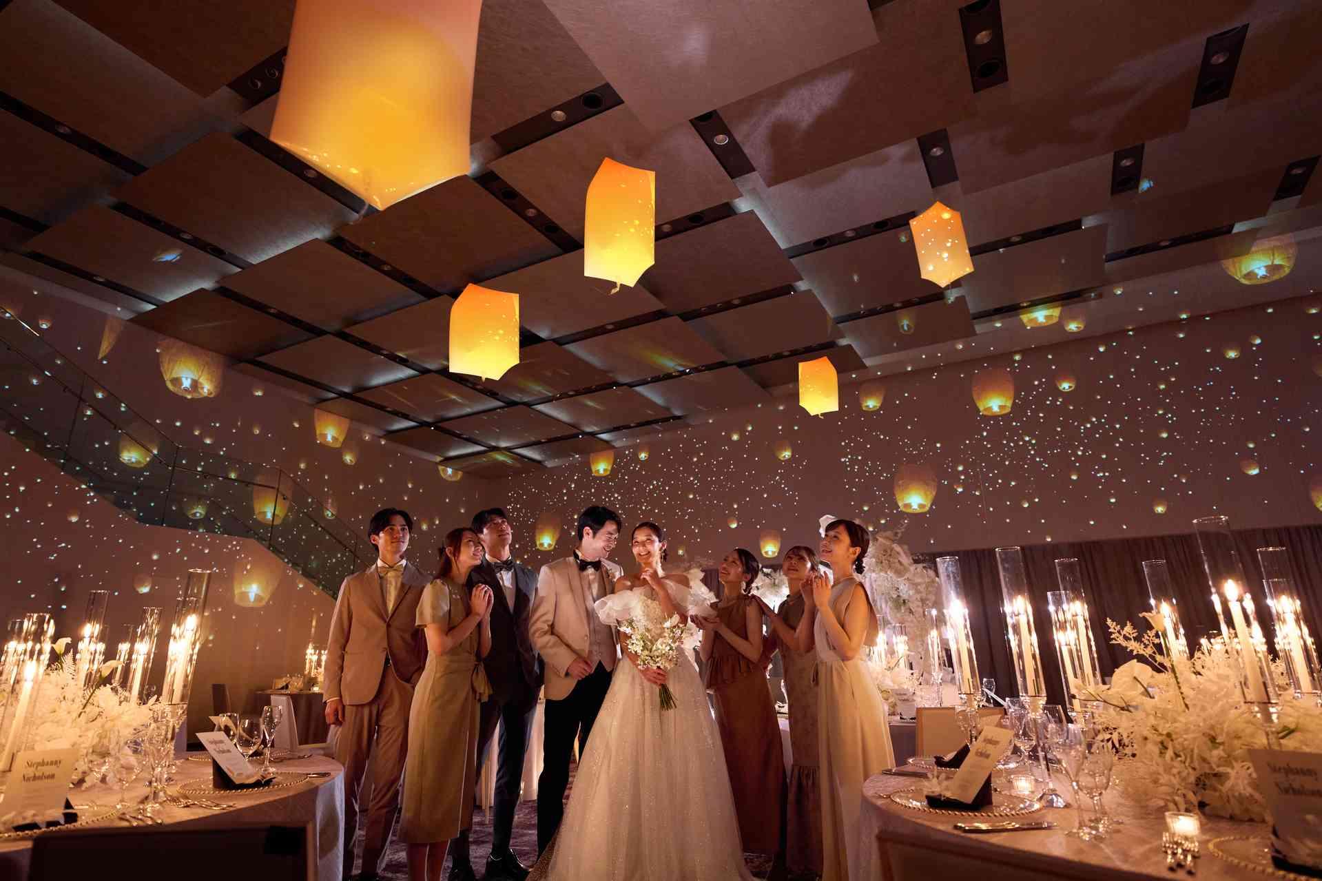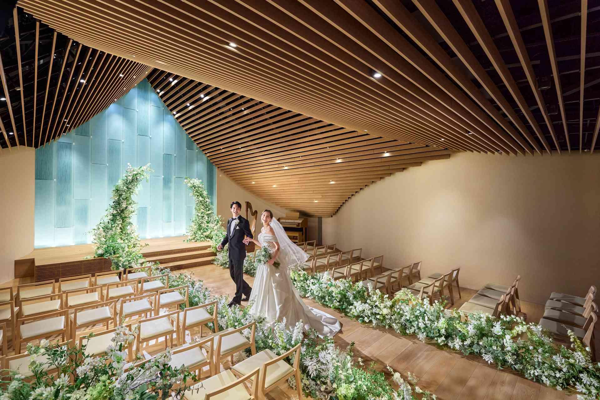 特長的な天井は、全体でシャンデリアをイメージしたもの。透過性のある素材が光のグラデーションを生み出し、 花嫁にやわらかな光をまとわせる。【収容人数30~90名(推奨人数30~70名)】