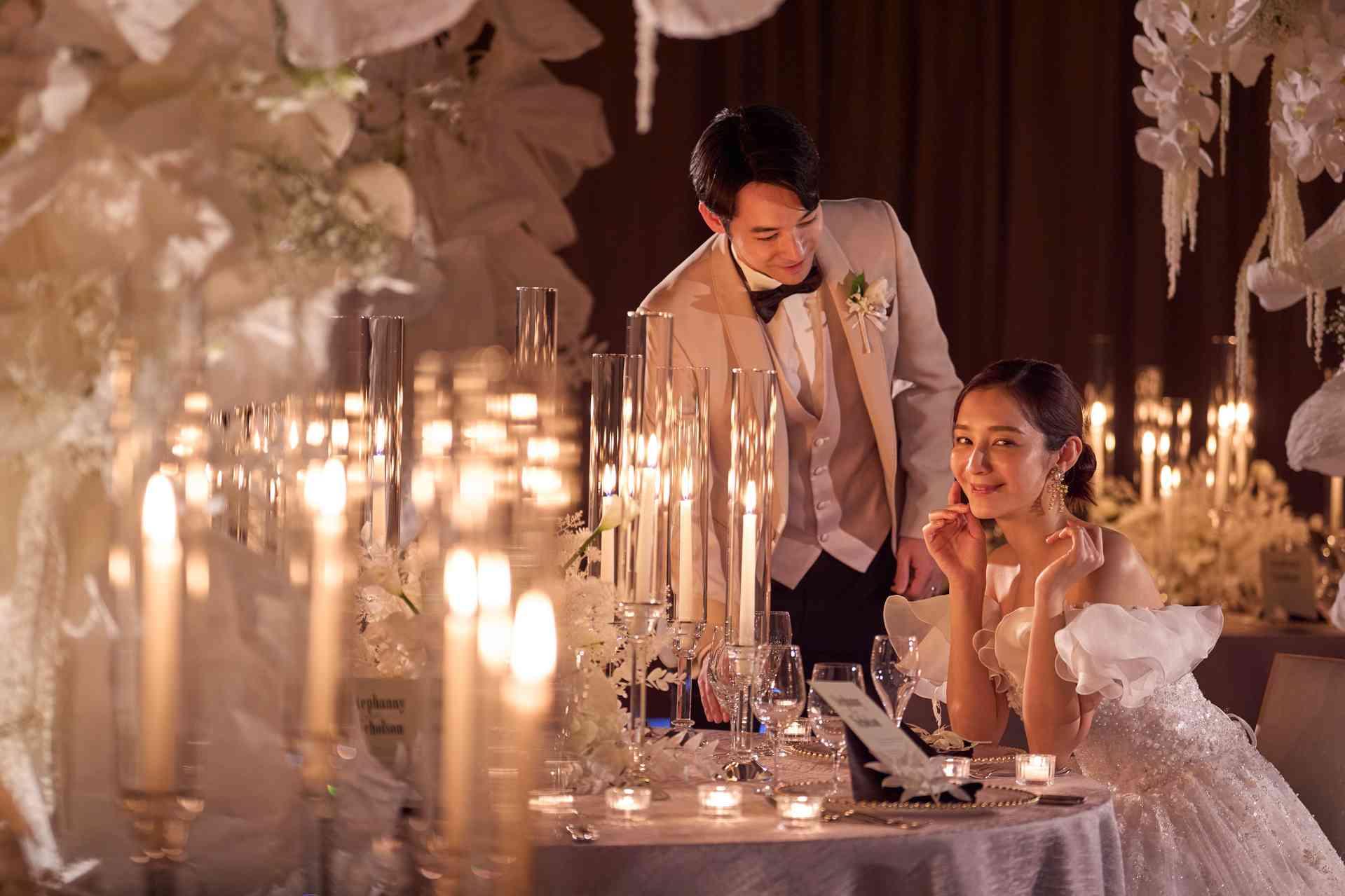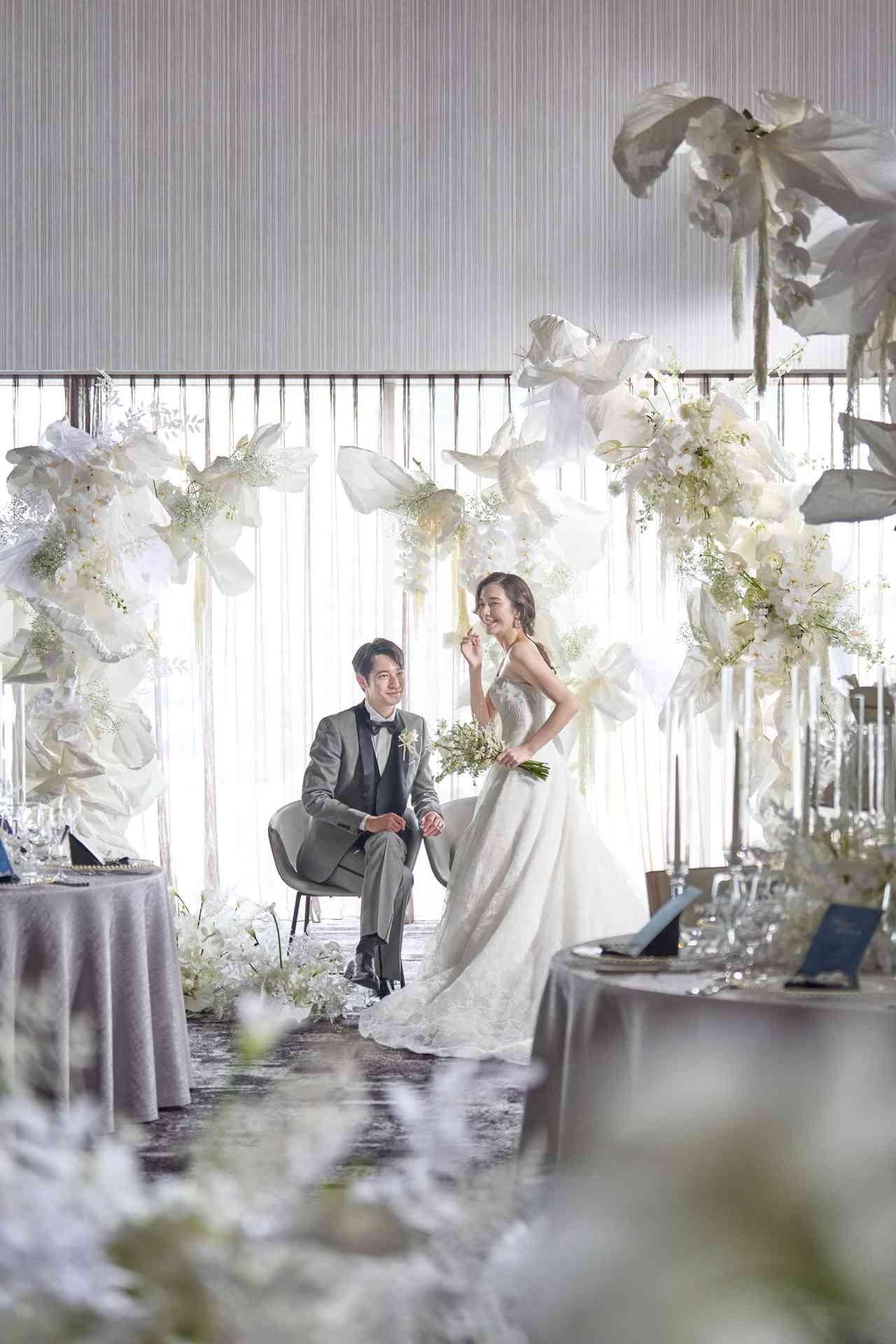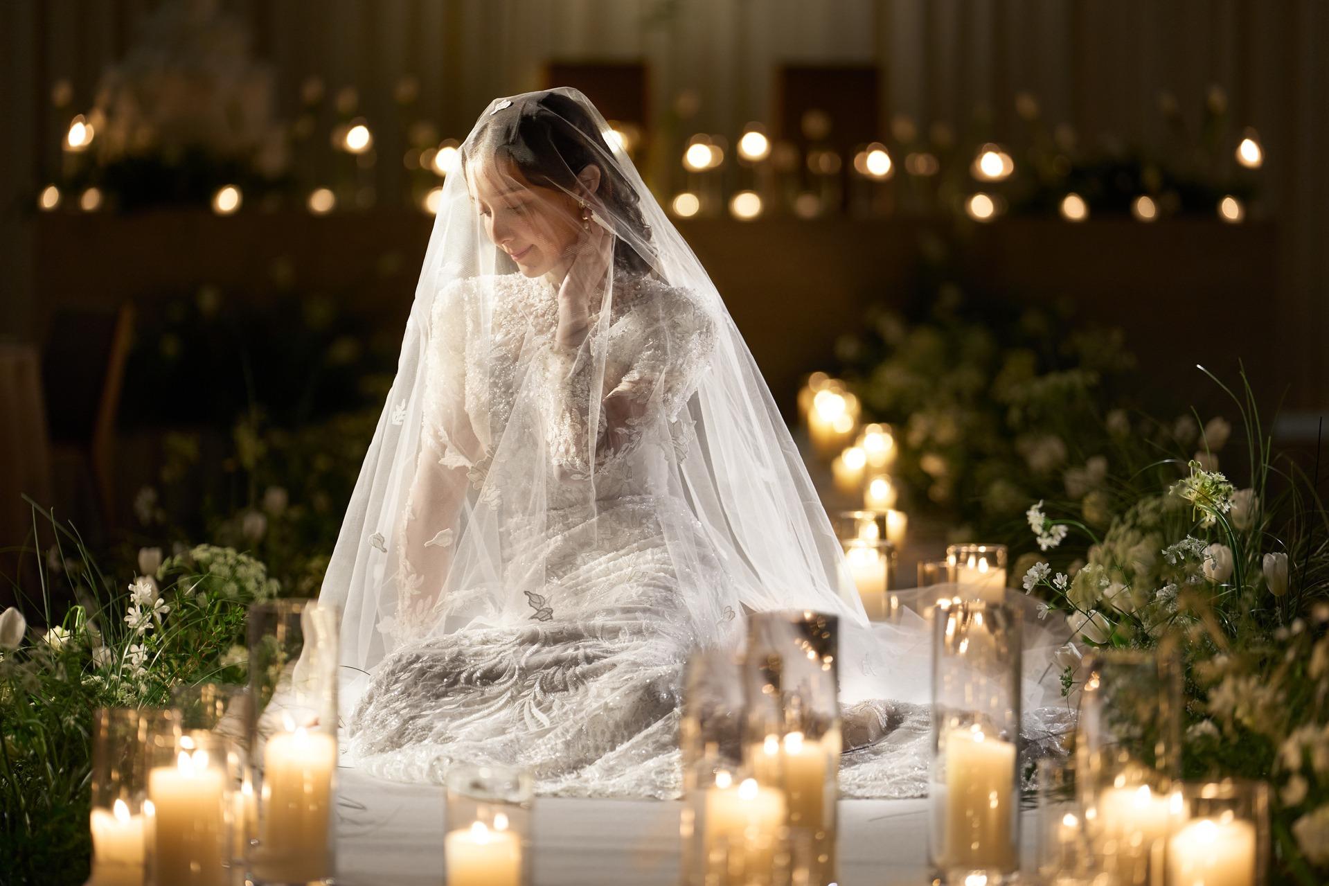 特長的な天井は、全体でシャンデリアをイメージしたもの。透過性のある素材が光のグラデーションを生み出し、 花嫁にやわらかな光をまとわせる。【収容人数30~90名(推奨人数30~70名)】
