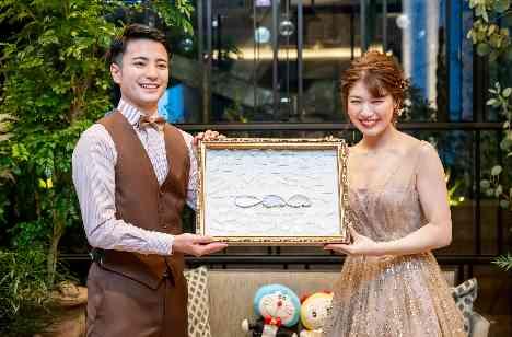 沖縄挙式のお披露目から始まるパーティは大きなスクリーンから至福があふれでて、自然とその世界に魅かれます。この瞬間を過ごした思い出として、ゲストの皆様と一緒に仕上げた結婚証明書は、沖縄を連想するシーグラスアート。大切な皆様に優しく包まれたお二人のアゲートを見ながら喜びが止まらず、最高の笑顔でお披露目を。