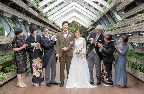 自然と調和した会場はさまざまな場所で、自由度高く、演出を楽しむことができます。緑に囲まれた道が続くグリーンウォールではご両親・ご姉妹との家族写真を、大空の下のウッドデッキではゲストの皆様のお出迎えを。おひとりおひとりにしっかり感謝をお伝えしながら、楽しいシチュエーションにもこだわられたゲスト想いのお二人らしい演出です。