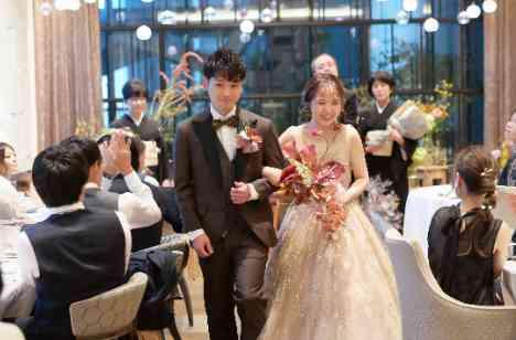 イエロー色をアクセントに様々なピンクが彩る高砂は、お二人の優しさを映し出すあたたかな空間。各シーンにゲストの皆様を交えて一緒に楽しみ、共有するパーティは改めて出会いに感謝し、大切に想う尊い時間に。エレガントなイメージチェンジのお色直しはゴールドグリッターが美しいチュールドレスに、マゼンタ色のスタイリッシュブーケでご入場。素敵な笑顔と「ありがとう」「おめでとう」が会場いっぱいに咲き誇ります。