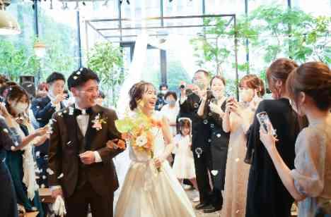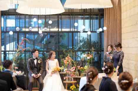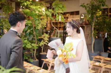 お二人のセレモニーのはじまりはしっかり感謝をお伝えすることから、おひとりおひとりにお手紙をご用意されました。大好きなグリーンと皆様に見守られながら、それぞれの言葉で問いかける誓いの時間はとても愛らしく、和やかな雰囲気に。皆様の笑顔あふれるお二人の門出にはシャボン玉の輝きとフラワーペタルが祝福とともに華やかに舞います。