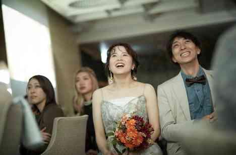 大きな窓から降り注ぐ陽光は、透明感あふれる美しさで幸せなシーンを照らす演出に。タンバリンのリズミカルなご入場は「パーティを楽しみましょう」というお二人からのメッセージです。ゲストの皆様も開放的に自由な空間で、コミュニケーションとフォトタイム中心のアットホームであたたかい時間。フラワービジューが輝くチュールカラードレスでクライマックスまで素敵な華やぎを。