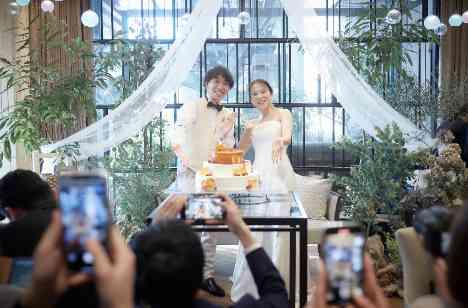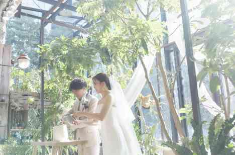 グリーンに囲まれたチャペルの前扉から、笑顔の花咲く晴れやかなご入場。ゲストの皆様にワンスコップずつ土入れをしていただいた植樹セレモニーと両家の水合わせの儀のお披露目は新しい芽吹きのはじまりを告げます。ボタニカルチャペルからグリーンウォールへ移動して迎えた門出のとき、自然を存分に満喫しながら光と祝福のリーフに包まれて未来への一歩を。