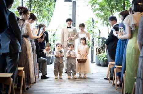 新緑の瑞々しい美しさに陽光が差し込む透明感あふれるボタニカルチャペルで誓いのとき。幸せに満ちた笑顔のご入場はゲストの皆様もなごやかにあたたかい雰囲気に包まれて。リングボーイのお子様から届くのはリュックにはいった大切な指輪。永遠の愛を意味する指輪が大切な人の薬指へ。門出ではフラワーガールの可愛さが心ときめくセレモニーに。