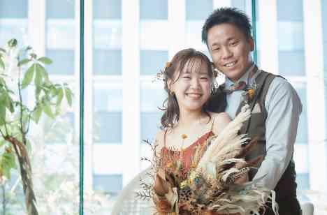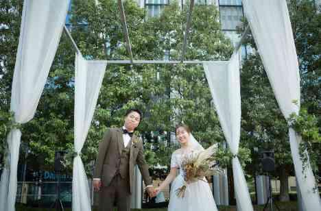 パンパスグラスやくすみカラーのドライフラワーが華やぐブーケを添えたウェディングドレスとナチュラルカラーのタキシードで、セレモニー前にお二人だけの特別なワンシーンを描くフォトウェディングをご堪能。都会的なビルと自然が織りなすアーバンナチュラル空間でフォトジェニックな思い出づくりを楽しまれました。降り注ぐ陽光や木の温もり、爽やかなグリーンもすべてがお二人の笑顔を彩ります。