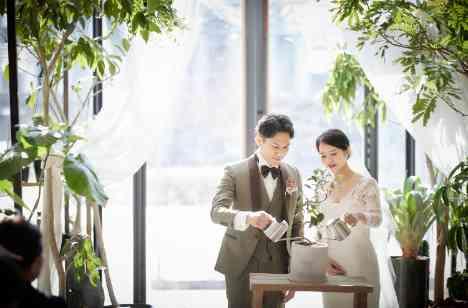 結婚証明書として選ばれたのはゴムの木です。花言葉は「永遠の幸せ」。ゲストの皆様にワンスコップずつブレンドしていただいた土に、お二人とそしてゲストの皆様の永遠のしあわせへの願いを込めてゆっくりとお水を注いでいきます。これから共に人生を歩んでいくお二人の未来のはじまりにぴったりの植樹セレモニーとなりました。