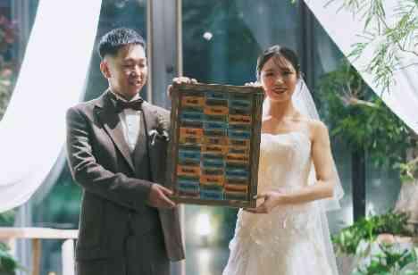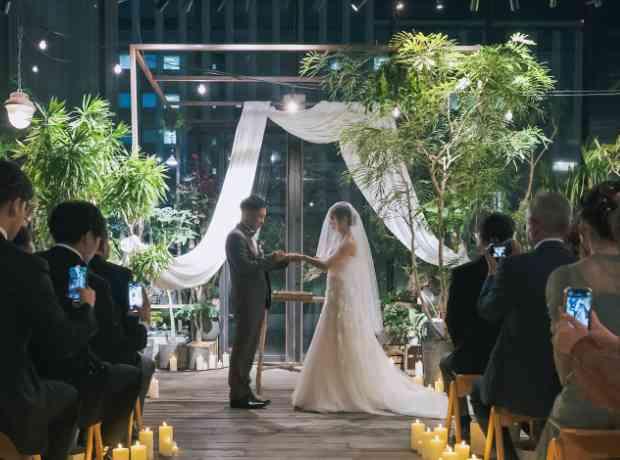 冬の訪れを感じはじめる深い夜空に包まれて、キャンドルの煌めく光に照らされた幻想的なボタニカルチャペルが誓いのときをより感動的に映し出します。ウッドピースの結婚証明書はDIYとヴィンテージ好きなお二人の想いが詰まった手作りの証明書。セレモニーの最後には門出の節目として、親御様に感謝の気持ちをお伝えされました。