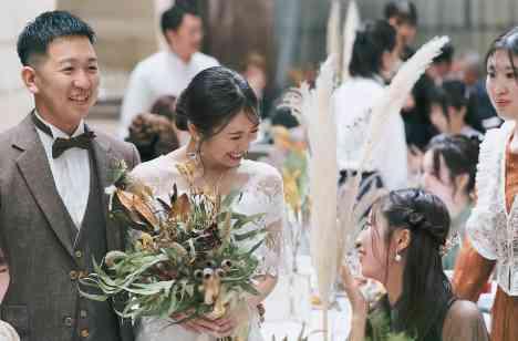 お二人の結婚式は先にパーティを、その後、誓いを立てる宴後挙式のスタイルでした。お料理・会話・様々な演出を一緒に楽しむパーティは時の流れとともに緊張もほぐれ、自然体に。これまでの日々を振り返るきっかけにもなる結婚式。セレモニーはお二人とゲスト全員がひとつの輪のように、より一体感のあるセレモニーとなりました。