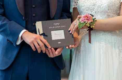 ご友人との思い出の1ページはテーブルラウンドで会話を楽しみながらアルバムへ。ゲスト全員と一緒に作ったアルバムのラストページは結婚証明書としてお二人でサイン。 退場時の最後の一礼では成婚宣言を行いました。『これからも共に色づいていきましょう』の想いを込めてオープニングは緑色、エンドロールは黄色に色づいたお二人の思い出の場所のイチョウ並木の映像を流しました。