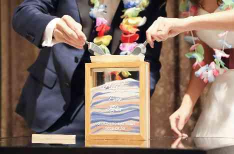 ゲストの前で指輪交換のお披露目。指輪の箱はこの日初めて開けました。新郎様から新婦様へ指輪を…映っているのはおもちゃの指輪!可愛いイタズラ付きの指輪交換に♪結婚の証明として行ったサンドセレモニーではゲストに事前に色付きで5つの大切なことをお見せして、1番大切だと思うことと同系色のものを出していただきました。おひとりずつ映し、二人が色の砂をお入れて完成させていきました。