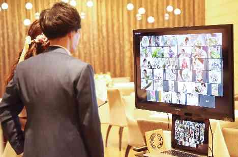 乾杯のコーラなどパーティで使うものは事前にゲストにお届けしました。その中に入っている野菜を使ってサラダ選手権を開催。5分程でできるように下準備をお願いし、一斉にお披露目!お二人が1番好きなサラダを作ったゲストには景品をプレゼント。ウェディングケーキは夏らしいミルクレープ。最後の仕上げはお二人が!画面越しでもホカホカするようなあつ〜いファーストバイトもお届けしました!