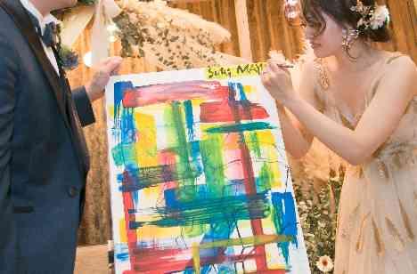 パーティではゲストと一緒に創りあげたキャンパスにサインをする宴内挙式を行いました。ハワイ挙式の様子は大きな2つのスクリーンに映してお披露目。お二人の幸せがスクリーンからも溢れるほどに沢山伝わってきました。