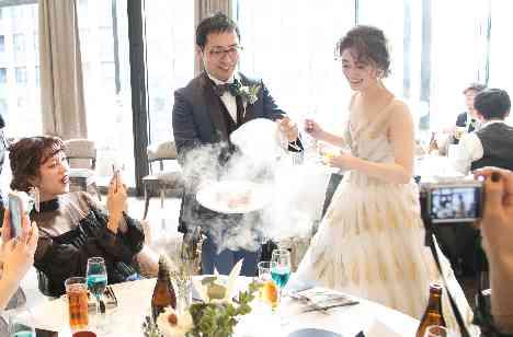 テーブルラウンドではお二人で料理演出を披露。ファーストバイトは二人羽織。新郎様の大好きなキャラクターのアイマスクで参戦!ゲームではドレス色当てとテーブル対抗ビンゴ大会を開催。ビンゴ大会はテーブルで一人当たると同じテーブルの全員もビンゴになるという素敵なルール。二人羽織もビンゴ大会もゲストに楽しんで欲しいお二人の気持ちが伝わる演出で、終始、笑顔いっぱいのパーティでした!